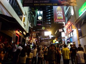 接著我們來到轉角的蘭桂坊,蘭桂坊是很奇妙的一條街,位在一個斜坡上,bar都是開放式的...