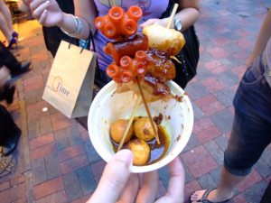 後來有去吃了路邊攤的咖哩魚蛋+炸肥腸+燙毛肚+燙章魚腳,其實都還挺好吃的耶!! 我們就在路邊嗑了起來,滿足啦!!